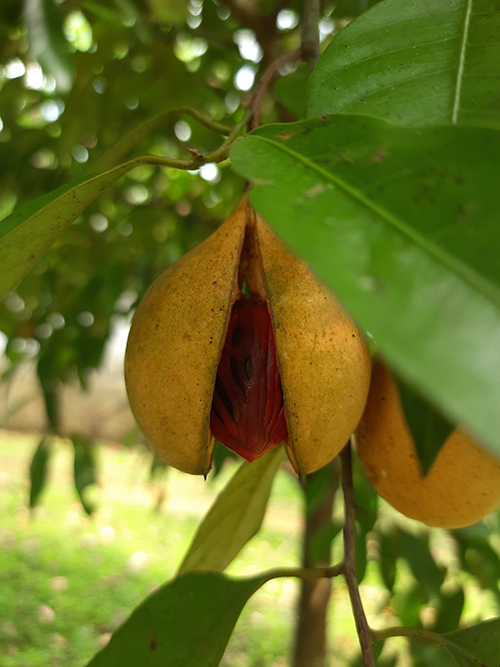 Nutmeg and mace are more than kissing cousins—these distinctive spices come from the same fruit-bearing evergreen tree, Myristica fragrans,  Once the yellow fruit, called the nutmeg pericarp, matures, it splits into two to reveal a firm white interior and shiny nutmeg seed with a bright red lace-like covering